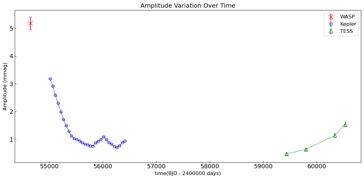 Figure 1: Long-term amplitude evolution of the primary pulsation frequency f1 in KIC 8712760 across WASP, Kepler, and TESS observations. Data points from different observational platforms are represented by distinct colors and symbols. The plot shows that the amplitude of this frequency generally weakened and subsequently exhibited variations over the long-term evolution.