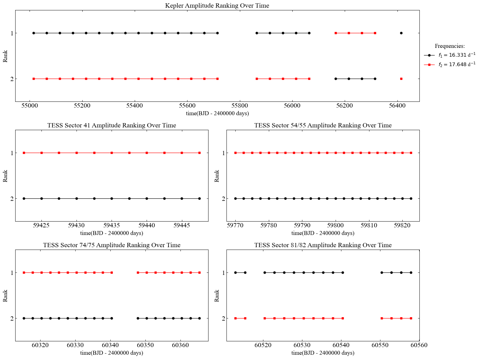 Figure 2: Evolution of amplitude ranking for the two main pulsation modes, f1 and f2, in KIC 8712760. The results indicate that f1 was the dominant frequency for most of the Kepler observation period. However, during parts of the TESS observation windows, f2 surpassed f1 to become the new dominant frequency. This suggests a possible redistribution of pulsation energy among different modes within the stellar interior.